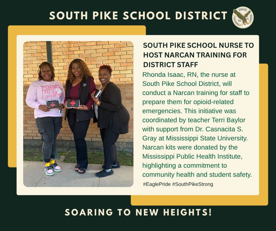 We’re excited to announce that Rhonda Isaac, RN, will lead a Narcan training session for South Pike School District staff this year. Thanks to the coordination efforts of Terri Baylor, a South Pike High School teacher, and Dr. Casnacita S. Gray from the Mississippi State University Extension Service, this initiative aims to equip our school personnel with the necessary knowledge and resources to handle opioid-related emergencies. The Narcan kits have been generously donated by the Mississippi Public Health Institute, showcasing our commitment to community health and the safety of our students. Join us in supporting this vital training!