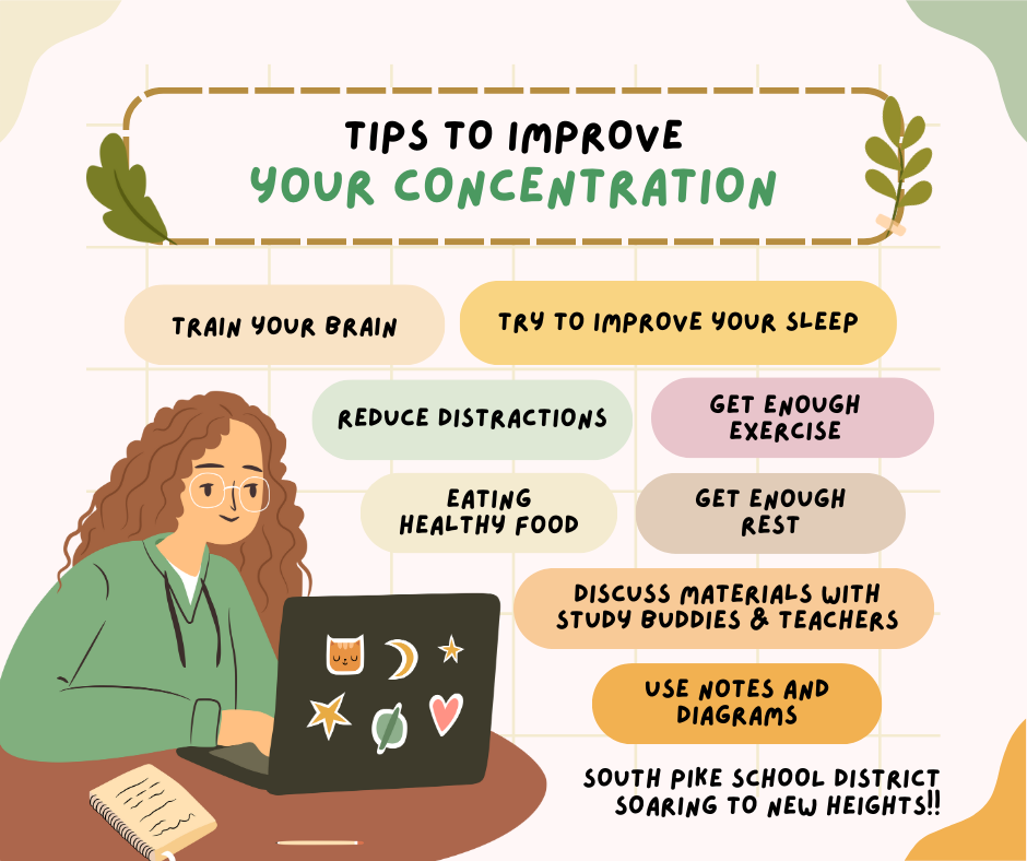 Hey, South Pike Eagles! π As we approach the 2nd Nine Weeks Testing, it's time to sharpen your study skills. Boost concentration by improving sleep quality, training your brain, and minimizing distractions. Incorporate regular exercise and a healthy diet to enhance focus. Donβt forget to rest, use notes and diagrams, and engage with study buddies and teachers. Together, we can soar to new heights at South Pike School District! ππͺ #SouthPikeStrong