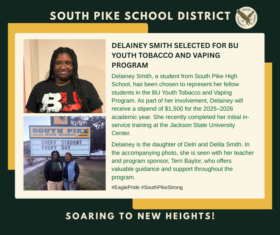 Weβre proud to announce that Delainey Smith, a student from South Pike High School, has been selected to represent her peers in the BU Youth Tobacco and Vaping Program. As part of her role, Delainey will receive a $1,500 stipend for the 2025β2026 academic year. She's already completed her initial training at Jackson State University Center, thanks to her teacher and program sponsor, Terri Baylor, who has been a tremendous support. Join us in congratulating Delainey on this amazing opportunity! π